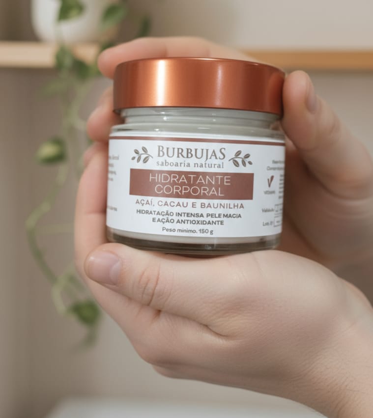 Hidratação intensa, ação antioxidante, pele macia e muito cheirosa! Rico em manteiga de cupuaçu, óleos de pracaxi e açaí, pantenol, extrato de camomila e o aroma acolhedor dos óleos absolutos de cacau e baunilha e os óleos essenciais de laranja doce e patchouli.